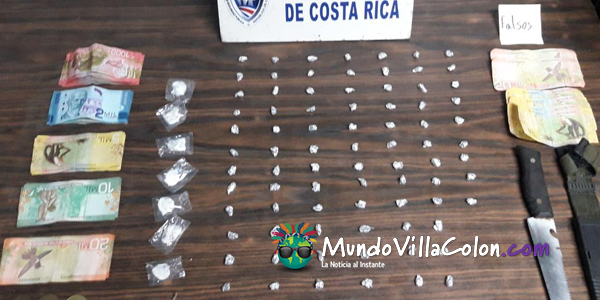 Dicho sujeto viajaba en un vehículo y al ser abordado le decomisan 99 dosis de aparente crack, 8 puntas de aparente cocaína, ₡296.665 y ₡ 60.000 en moneda falsa. Además, dos armas blancas.