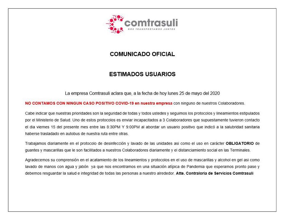 La empresa Comtrasuli aclaró una publicación mal intencionada que se dio esta mañana en redes sociales sobre tres conductores que fueron enviados incapacitados.