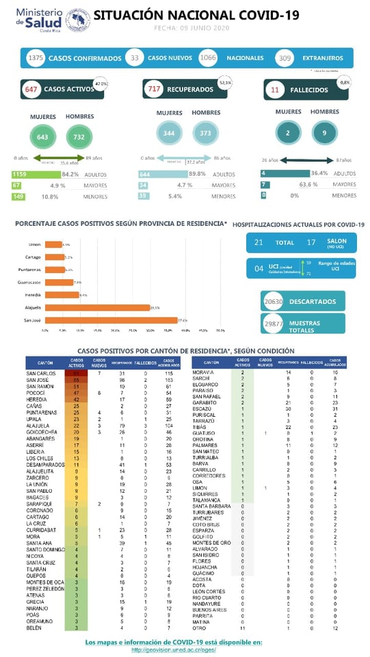 Según el reporte del Ministerio de Salud al día de hoy martes  9 de junio se registran 33 nuevos casos de COVID-19, para un total de 1375 casos confirmados, con un rango de edad de cero a 89 años.