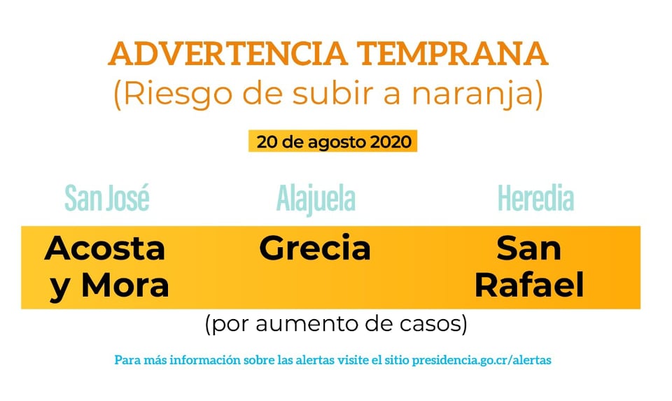 El jefe de operaciones de la CNE indicó que los cantones de Acosta y Mora de la provincia de San José, el cantón de Grecia en Alajuela y el cantón de San Rafael en Heredia registran un fuerte aumento en los casos reportados en las semanas 31, 32 y 33 por lo cual podrían llegar a alerta naranja la próxima semana de seguir con el crecimiento.