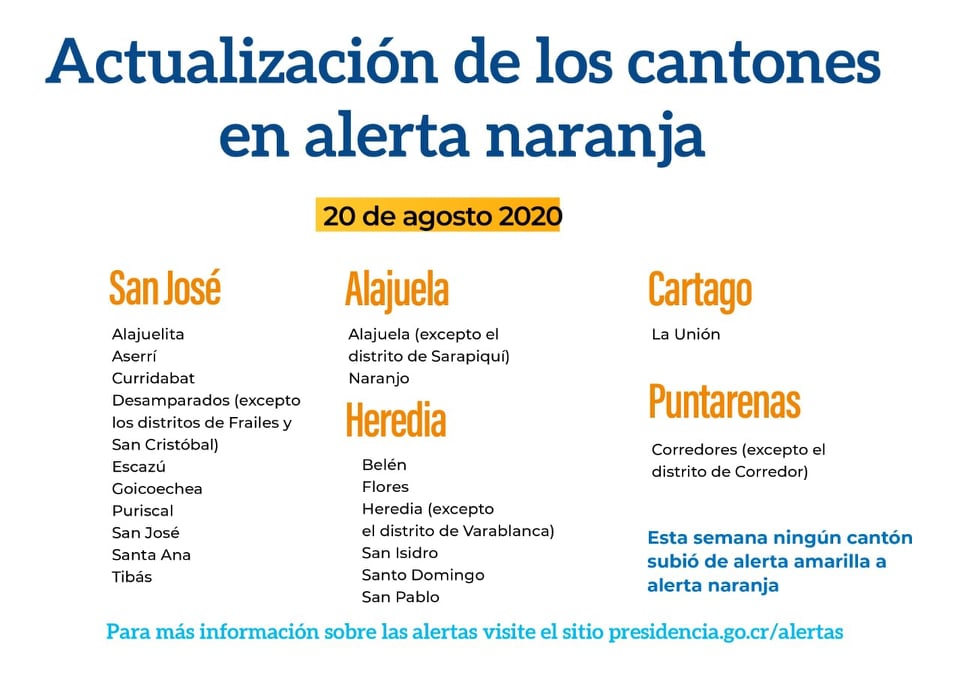 Tras los cambios indicados, los cantones que se encuentran en condición de alerta naranja son: