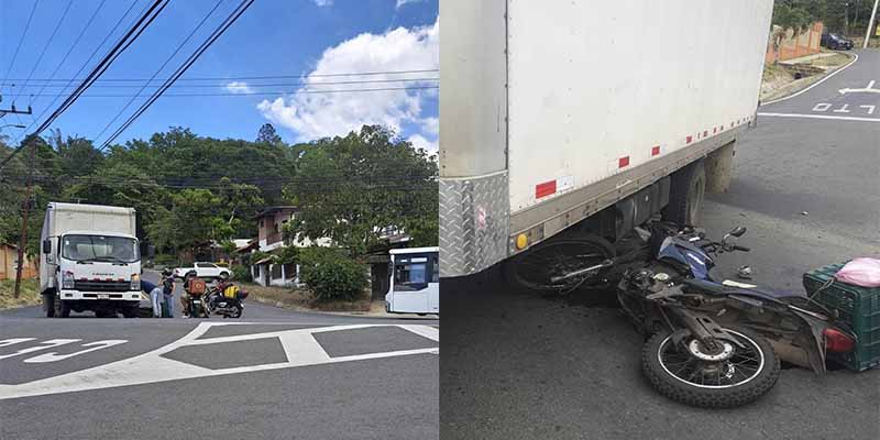 Precaución se reportó una colisión entre una motocicleta y un camión en el cruce hacia La Trinidad de Mora frente al Más X Menos de Ciudad Colón.