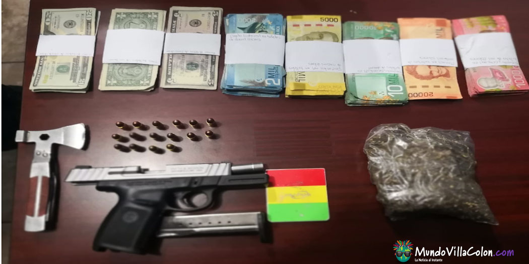 Además, los sujetos trataron de deshacerse de la evidencia que portaban, pues arrojaron un bolso, que al ser revisado contenía una pistola calibre 9 m.m. con 16 proyectiles, un hacha pequeña, 802.000 colones, 118 dólares y 65 gramos de marihuana.