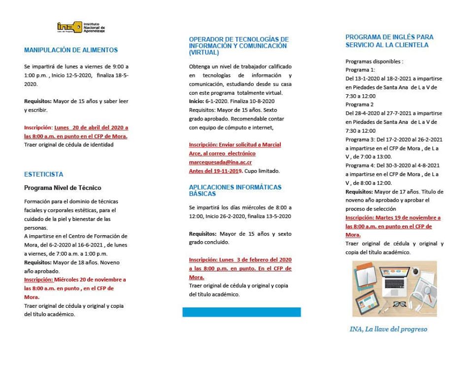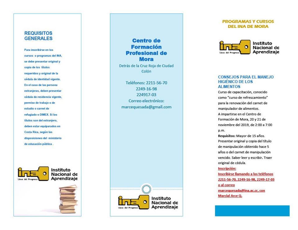 El Instituto Nacional de Aprendizaje INA comunica la apertura de los siguientes cursos los cuales se impartirán en el Centro de Formación Profesional de Mora (ubicado: detrás de la Cruz Roja de Ciudad Colón).